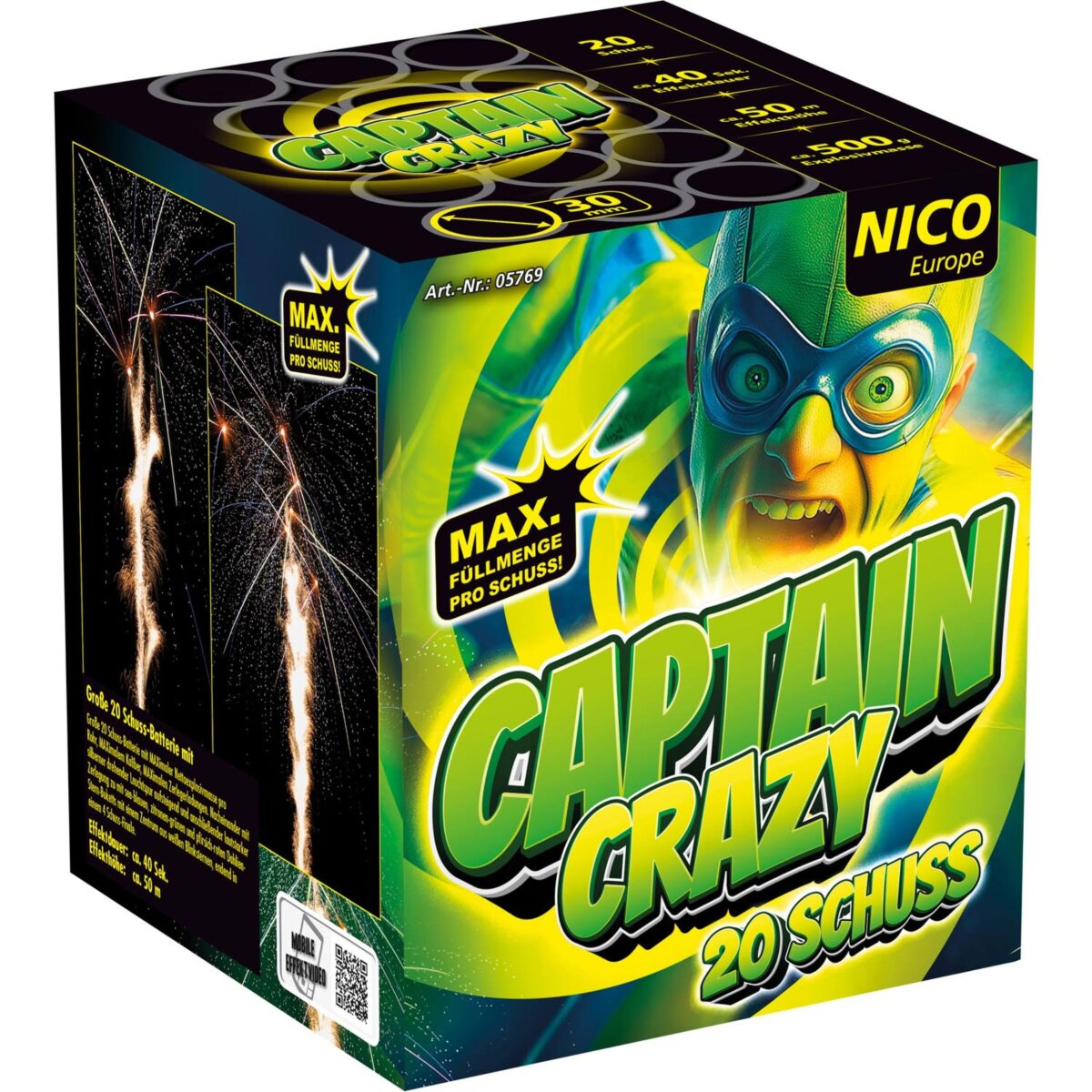 Bist du bereit für den ultimativen Feuerwerks-Wahnsinn? Captain Crazy von Nico Europe bringt deinen Nachthimmel zum Beben! Mit 20 brachialen Schüssen, einer Effekthöhe von bis zu 50 Metern und 500 g NEM setzt diese Feuerwerkbatterie neue Maßstäbe.